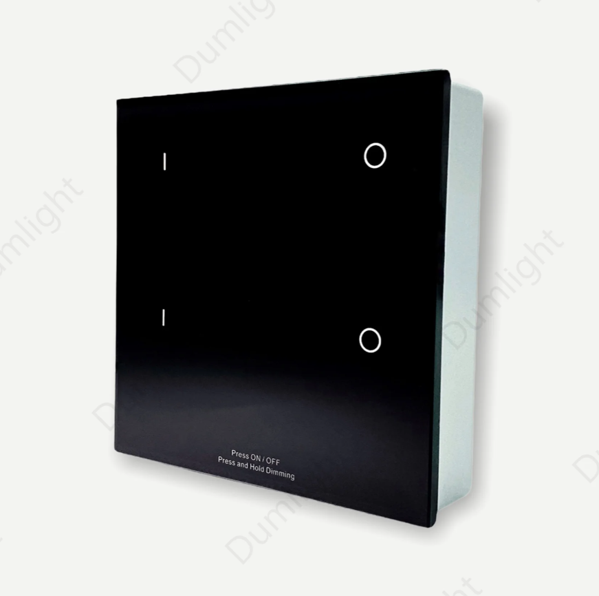 Настенная сенсорная панель с диммированием двух зон. Глянцевая стеклянная чёрная поверхность. Устанавливается накладным способом на стену, возможно использование в качестве настольной панели, т.к. не требует проводов. Каждая зона может быть привязана к нескольким контроллерам Ampe. Сенсорные клавиши со светодиодными индикаторами и звуковым сигналом. Высокопрочное стекло с сенсором повышенной чувствительности. Питание от двух батареек ААА. Может быть использована для создания беспроводных проходных выключателей из 2х и более мест включения, на 2 зоны освещения.
